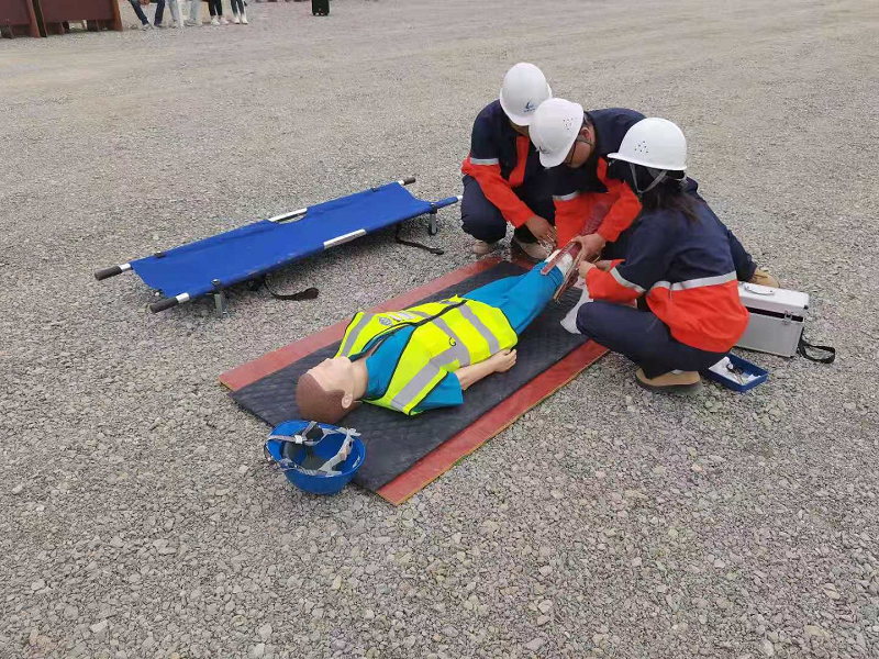 演練地點選擇存在高處作業(yè)風(fēng)險的裝卸車棧臺管廊橋架,模擬了施工人員不慎從高處作業(yè)平臺墜落的情景。事故發(fā)生后,現(xiàn)場安全巡檢人員第一時間向應(yīng)急救援領(lǐng)導(dǎo)小組組長報告,組長立即啟動應(yīng)急救援預(yù)案。各小組奔赴現(xiàn)場后,立即分析現(xiàn)場情況,警戒組拉設(shè)警戒線封鎖現(xiàn)場,醫(yī)療救護組立即對傷著進行現(xiàn)場急救,工程搶險組對現(xiàn)場道路進行疏通,各救援小組各司其職,迅速開展應(yīng)急救援和搶險。